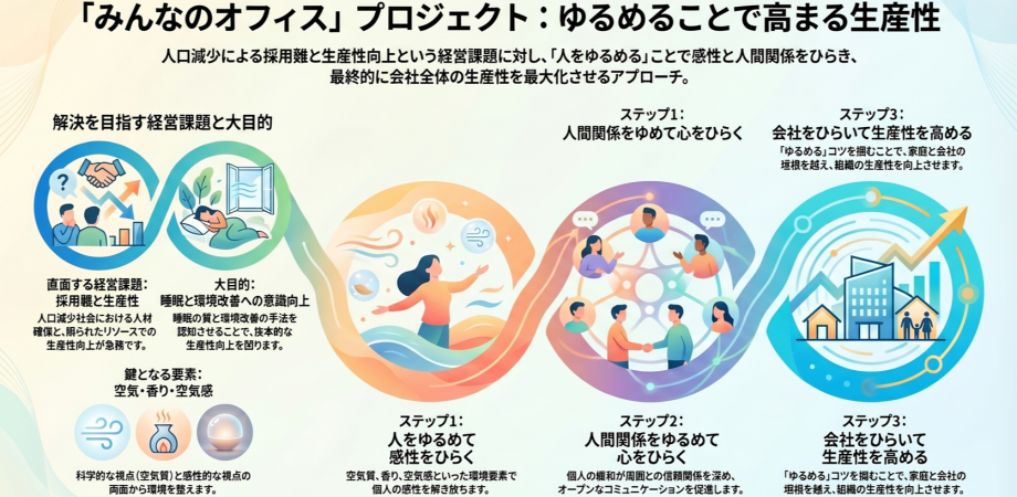 みんなのオフィスプロジェクトは、職場の人や環境を整えることで、生産性向上や人間関係構築から、会社が直面する離職や採用など人の問題を本質的に取り組み、人を大切にする持続可能な経営を構築するためのプロジェクトです。